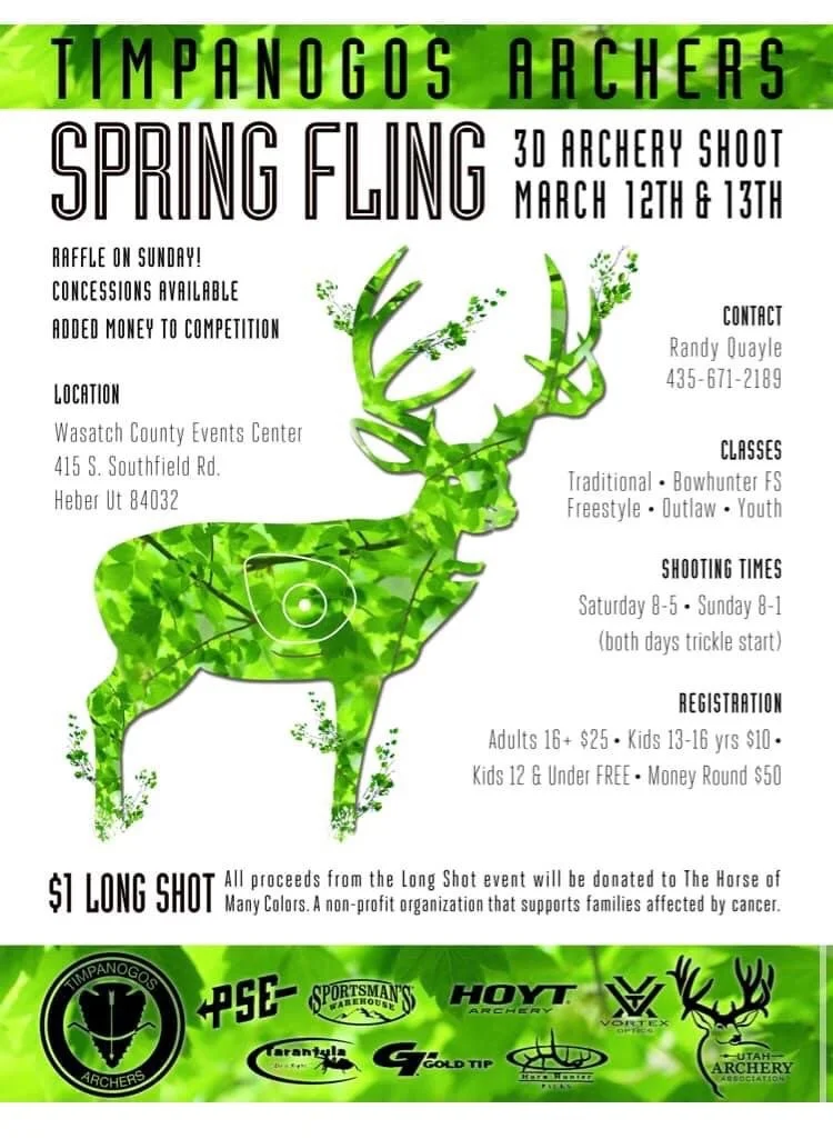 Spring Fling 3D Saturday, March 12, 2022 8:00 AM 08:00 Sunday, March 13, 2022 8:00 AM 08:00 Utah Archery Association (map) Google Calendar ICS Spring Fling 3D Host Club: Timpanogos Archers Contact: Randy Quayle 435-671-2189